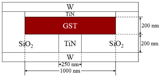 Cross-sectional view of the simulated mushroom phase change memory (PCM) cell.