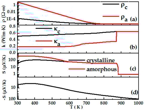 Seebeck coefficients of GST (Figure 2c) are measured up to 740 K, and modeled to be constant between 800 K and 873 K, and assumed to have a constant value of 1 µV/K in the liquid phase []. Seebeck coefficients for TiN (Figure 2d) are measured in the 300–800 K range and extrapolated to 1000 K [].
