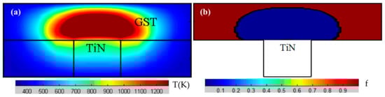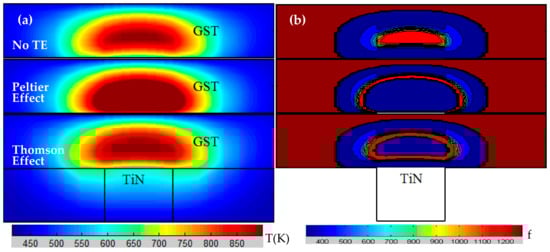 The simulated temperature distribution within the mushroom PCM cell at the time of maximum temperature occurrence, that is the end of the RESET pulse, is plotted in Figure 3a, where thermoelectric effects are not considered. Although our model is a three-dimensional finite element simulation, all the results are given in two-dimensions to be able to compare the variation of temperature profiles and phase distributions with and without thermoelectric effects more plainly and clearly. A 2.6 mA, 50 ns input pulse is applied to heat the GST material adjacent to the GST–BE interface above its melting temperature, and it subsequently cools into the amorphous phase. The crystallization fraction (f) inside the GST layer is shown in Figure 3b. The GST–BE interface is completely covered by the amorphous GST plug, forming a high-resistance path on readout between the top and bottom electrodes. The corresponding cell resistance increases two orders of magnitude as compared to the original value, and then the RESET operation is accomplished.