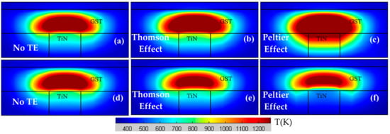 Because of the different occurrence region, these thermoelectric effects have different influences on the temperature profiles. The Thomson effect mainly occurs in the GST materials, and slightly raises the temperature reached in the GST layer, shown in Figure 4b, similar to the results of the pulse amplitude increasing. The Peltier effect in the cell with the 250 nm width bottom electrode, simulated in this paper, results in a larger change in the thermal profiles compared with the Thomson effect (Figure 4c), because of the greater energy released in the active region and, more importantly, a more critical location at the GST–BE interface. Therefore, the Peltier effect can cause the position of the hot spot to shift towards the GST–BE interface, heat the GST material near the interface more easily, and then, vastly influence the result of the RESET operation. On the contrary, the Peltier effect hinders the RESET operation more seriously with the negative polarity, as plotted in Figure 4f.
