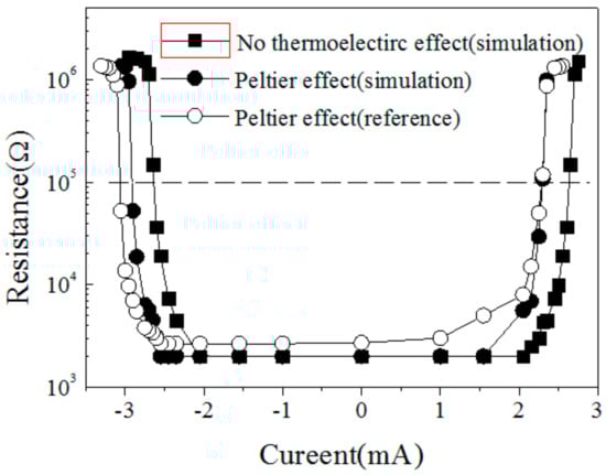 The cell resistance as a function the RESET current is plotted in Figure 5. The current polarity has no impact on the RESET current (solid squares) when neglecting thermoelectric effects. In addition, the Peltier effect can force the programming current down to 2.3 mA in the positive bias and up to 2.95 mA in the reverse bias (solid circles), respectively. The RESET programming current polarity in the simulation (2.3–2.95 mA) is close to that in the literature data (2.3–3.2 mA, hollow circles) [], which confirms our simulation. Thomson heating in the mushroom cell is simulated as a contribution to 5% of the programming current reduction.
