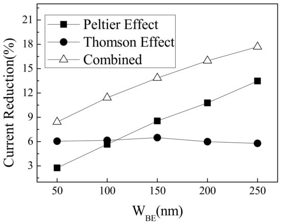 Impact of thermoelectric effects on the programming current for the RESET operation with the bottom electrode width (WBE) scaling from 250 nm to 50 nm, assuming isotropic downscaling.