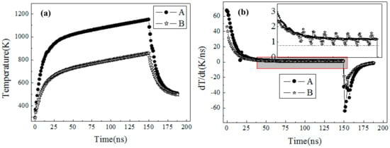 (a) Variations of the temperature and (b) heating/cooling rate at two different positions in the GST layer. A at the position of the hot spot in the GST layer and B at the center of the GST–BE interface which marked in Figure 7a, respectively.