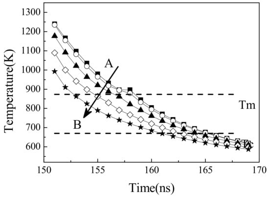 The cooling process in the GST layer was studied in detail, and the temperature variation between the A and B points is plotted in Figure 9. Because of the asymmetry of the cell structure, the central part can reach higher temperature, and then cools down more rapidly. It is well known that crystallization temperature and crystallization time determine the formation of small crystalline nuclei of critical size and their subsequent growth, respectively. During the cooling stage, the crystallization proceeds as the temperature drops from melting temperature (Tm) to crystallization temperature (Tc), shown as the dotted line in Figure 9. Compared with the final phase distribution in Figure 7b, only the GST material at the center of the GST–BE interface has a long crystallization time, leading to complete crystallization together with grain growth. For the annular-like temperature distribution in the GST layer, there is an annular crystalline region formed in the PCM cell. The inner part has insufficient time for grain growth, and the GST material in the outer part does not crystallize due to insufficient heating. Hence, the phase change dynamics in the case of the SET operation are more rigorous to the temperature than that of the RESET operation; the GST material near the GST–BE interface requires a high enough temperature and a proper cooling rate for complete crystallization.