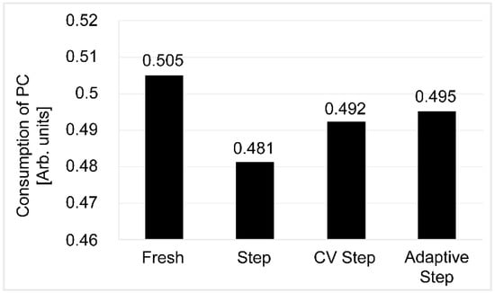 The plot shown in Figure 7a indicates that the number of feasible cycle numbers for the new CV step pattern charging method with a 20% capacity degradation in the 3.2 Ah battery increased by 48.9% when compared with the conventional CCCV step charging method, while those of the adaptive step rapid charging method increased by 61.7%. In addition, the conventional step charging procedure resulted in a sharp drop in the available capacity at the beginning of the cycle, while the proposed novel adaptive charging pattern gave no drop in capacity.