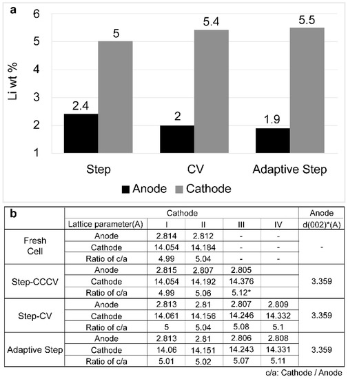 Bulk characterization of the electrodes was carried out by ICP-MS and XRD, as shown in Figure 11. Considering that the cell was completely discharged prior to its disassembly, a significant degree of degradation occurred in the cell based on the CCCV step charging method. This was determined based on the fact that the quantity of Li found in the anode was large, whereas that found in the cathode was small (Figure 11a).