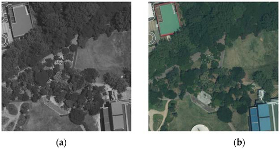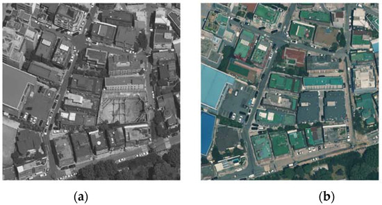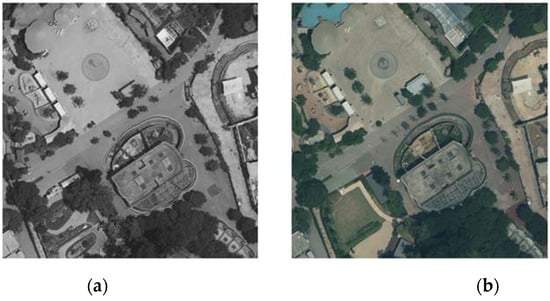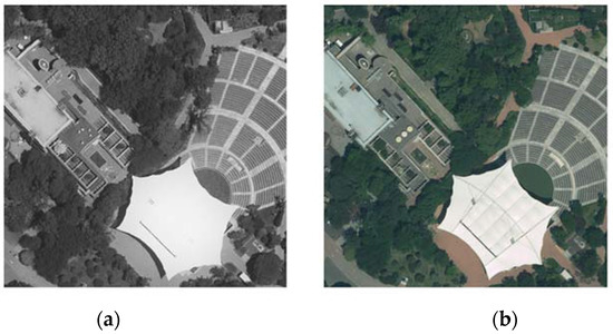 In the case of satellite images, modern systems acquire a panchromatic (grayscale) image, with high spatial and low spectral resolutions, and a multispectral (color) image that has complementary properties [4]. In other words, grayscale and color images with different resolutions over the same time period are provided. In order to perform colorization through the color information of the multispectral image while maintaining the high resolution of the panchromatic image, the two components are fused, which is called pansharpening [5]. The fused images provide increased interpretation capabilities and more reliable results [6]. However, this colorization method is confined to satellite images that provide panchromatic and multispectral images of the same time periods, making this type of colorization of aerial images impossible.