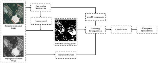 In order to overcome these limitations, this study presents a new, fast learning-based technique for the colorization of grayscale aerial images that colorizes them without any user intervention. The algorithm uses one grayscale image as the input and one-color image for reference, both of which have similar seasonal features at the same location. Then, the reference color image is converted from the Red-Green-Blue (RGB) color space to a CIE L*a*b (Lab) color space in which luminance and two-dimensional (2D) color information are stored. Change detection between the input grayscale image and the luminance of the reference color image is performed, and the unchanged region is selected as training pixels, which allows for the extraction of meaningful training data. For colorization, the relationships are established through learning between features of the input grayscale image and the 2D color information of the reference color image based on training pixels. In other words, for the corresponding unchanged region, the color relationships between the two images are directly established, and the colors for the changed region are predicted. At this time, the study’s main technical framework is random forest (RF) regression. Random forest is a data-mining method that has some advantages over most statistical modeling methods [20], including: the ability to model highly nonlinear dimensional relationships; resistance to overfitting; relative robustness with respect to the presence of noise in the data; and the capacity to determine the relevance of the variables used.
