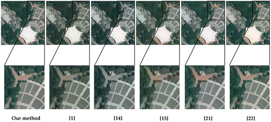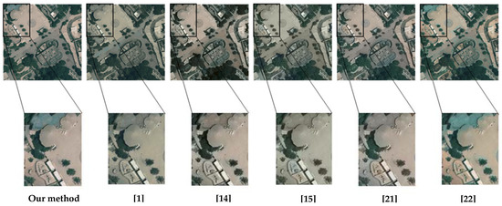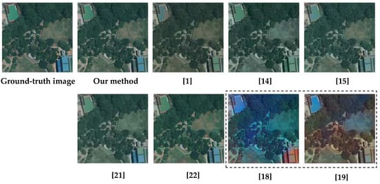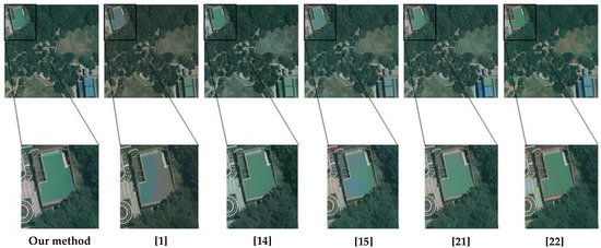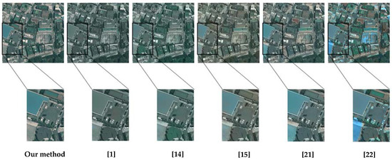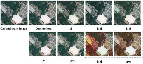 As can be seen in Figure 6, Figure 7, Figure 8 and Figure 9, our approach more accurately predicts colors than do the other methods, producing results with fewer artifacts. In Figure 6, the color determined by our method is much clearer, especially in the red portion of the ground that is correctly recovered without artifacts. Figure 7 is a site with many human-made objects, and our method demonstrates remarkably high performance in color prediction, while other methods completely fail to correctly predict colors or contain halo effects. Figure 8 also has many human-made objects that contain multiple colors in the area of vegetation, which makes it more difficult to predict the color values at this site. Except for our method and that of Deshpande et al. [22], the colors of human-made objects are not correctly predicted, which indicates that our method is robust for color prediction. Figure 9, the urban area, contains the most complex structure and the greatest variety of colors for prediction. Although the results of the proposed method also contain slightly turbid colors, our method produces significantly better results than do the other methods. In other words, our method retrieves more color values with fewer artifacts from the reference image; these details can be confirmed in Figure 10, Figure 11, Figure 12 and Figure 13.