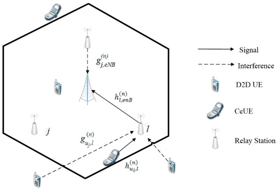 In Figure 1, each uplink data transfer includes two hops. In the first hop, the ul-th UE transmits the signal to the lth relay station by the channel gain . The lth relay station relays the transmission to the base station using the nth resource block (RB). However, when the uj-th D2D UE transmits signal to the lth relay station, the interference link gain will be transmitted to the lth relay station.