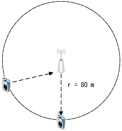 In the system model, it is assumed that the base station coverage area is a circle with a radius of 175 m. In this area, there are three relay stations that are uniformly deployed with a triangle, as shown in Figure 1. The coverage area of each relay station is a circle with a radius of 100 m. The cellular UEs are uniformly and randomly distributed around the relay station. D2D pairs are deployed on a circle with a radius of 80 m around each relay station as shown in Figure 2. The numbers of UEs in the relay station are the same. It is assumed that the CSI of the links are known to the base station. The simulation parameters are listed in Table 1.