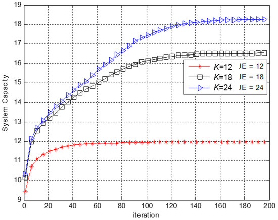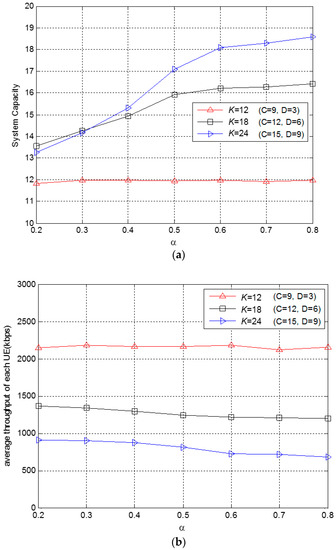 Figure 8 shows the comparison between the system capacity and the throughput obtained for K = 12, 18 and 24. In Figure 8a, if more UEs are found, there is a greater difference in the performance, indicating that the transmission capacity and system capacity are increasing. After the complex situation is raised to a certain value, the mutual influence is greater and the difference is the largest at 0.5–0.6.