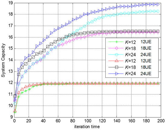The simulation parameters that are based on SPSO and RPSO are shown in Table 2. In Figure 3, simulation results show that when the total number of UEs are K = 12, the system capacity reaches 12 UEs. However, when K = 18, the system capacity reaches 16.5 UEs. Moreover, when K = 24, the system capacity is 18.3 UEs.