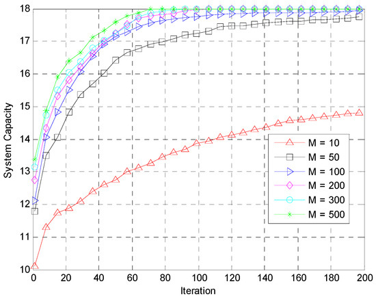 The simulation parameters based on GA are shown in Table 4. Figure 6 shows the system capacity for different population sizes in GA with K = 18. The objective function is in Equation (13). When M = 10, the system capacity performance can reach 15 UEs. However, when M ≥ 100, the system capacity reaches saturation with a near optimal solution with 18 UEs. From Figure 6, it is observed that the large population size can reach the optimal solution.