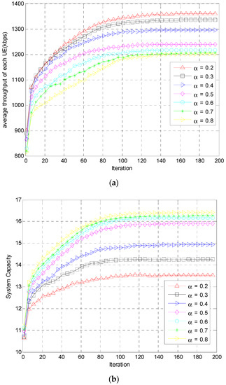 Figure 7 shows the simulated results with different weight values for UE = 18, which respectively represent the transmission capacity and system capacity of each UE. In Figure 7a, during the period of about the first 10 generations of this period, the rate of increase in the average throughput is similar regardless of the numerical value, indicating that the weight value has little effect. However, after the number of generations exceeds 10 generations, the weighting starts to have an effect. A smaller weight value results in a larger amount of transmission. Figure 7b shows that after more than 10 generations, a larger weight results in a larger system capacity. This result indicates that there is a conflict between maximizing the system capacity and the individual throughput of UEs.