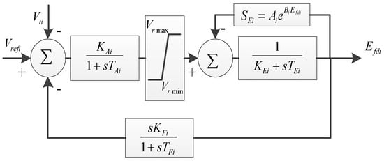 For a generator equipped with the IEEE type I voltage regulator as shown in Figure 1 for regulating its potential voltage, its dynamics could be described by Equations (6) and (7).