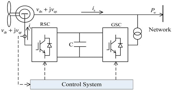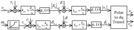 In this paper, the FMAC structure with two control loops is used as the control strategy for DFIG as shown in Figure 3, one for the terminal voltage and the other for the power output of DFIG []. It controls the generator terminal voltage and power by adjusting the magnitude and angle of the rotor flux vector, and has the advantage of