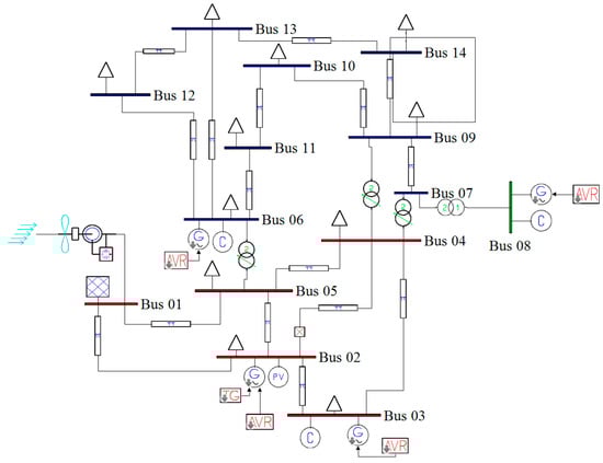 As shown in Figure 4, the modified 4-generator 14-bus IEEE system is used as the benchmark to investigate the impacts of adding wind farms (WFs) or capacitors on system transient stability. In this system, the dynamic models of four conventional generators are 4th order for transient stability analysis, while each generator is equipped with a IEEE Type 1 exciter. For wind farms, an aggregated model is used to investigate wind generation impact on the system transient stability [], the DFIG parameters are cited from [] with wind turbine parameters: Ktw = 0.6 p.u./rad, Dtw = 0.45 and Ht = 3.8 s. In this paper, the power system analysis toolbox (PSAT) developed by Dr. Federico Milano is used to conduct the transient stability analysis in this paper [].