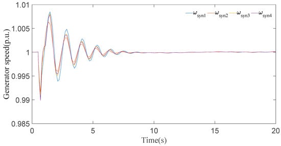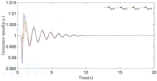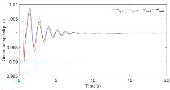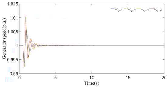 In this case, the wind speed was further reduced to 10 m/s. Based on the generator speed curves in Figure 15, the first peak also approaches the value 1.008 p.u. during the disturbance and then settles down in 9 s. The generator angle responses in Figure 16 clearly show that all generators undergo a short time period of transient fluctuation, and they all synchronize within 9 s. Based on the comparison of Figure 13, Figure 14, Figure 15 and Figure 16, it is shown that when the speed of the wind turbine decreases from a nominal value, the system instability does not change much.