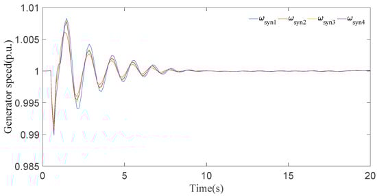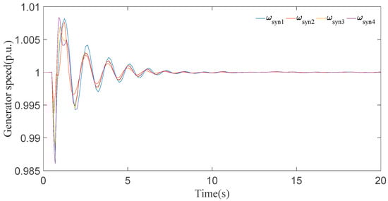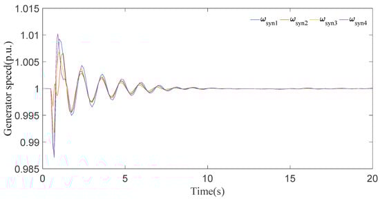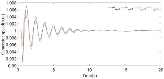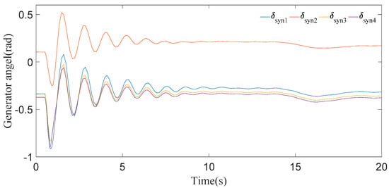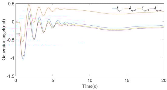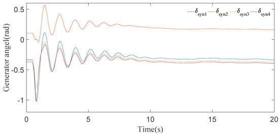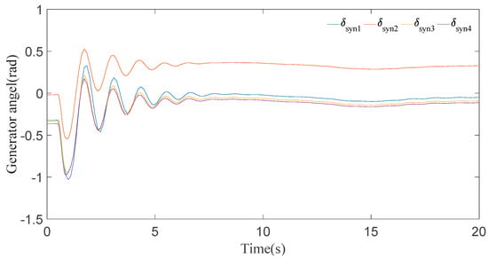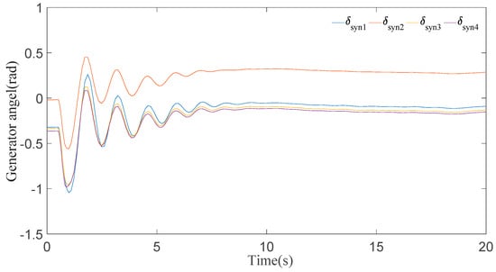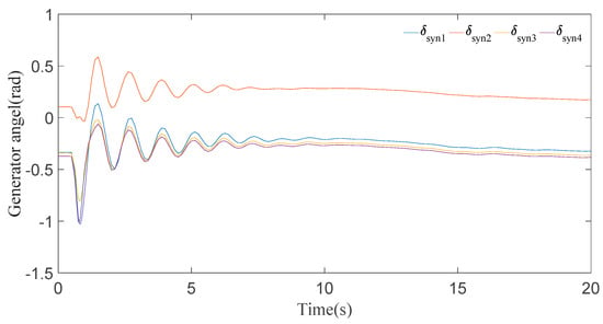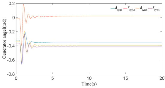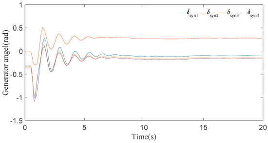 In this case, it can be seen clearly from the results for generator speeds in Figure 5 that the system is stable after a short time period of transients. The results in Figure 5 show that the first peak of generator speeds during the disturbance almost approaches 1.01 p.u. and settles down in 8 s. Now, if we look at the generator angle response in Figure 6, generator 2 has the maximal positive angle peak at 0.6 radian and generator 4 has the minimal negative angle peak at −1 radian, and all the generator angles are static at 20 s.