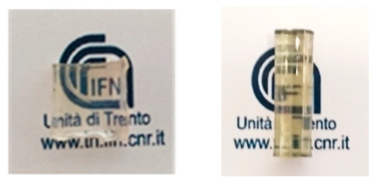 Photo of the as-prepared 90SiO2-10SnO2:0.5Er3+ monolithic square with size of 1 × 1 cm2 and thickness of ≈0.3 cm and the cylinder with diameter of 0.5 cm and length of 1.5 cm obtained after the heat treatment at 900 °C for 40 h.