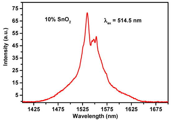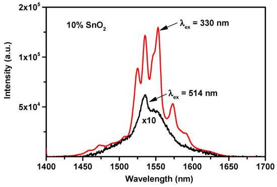 Under the indirect 330 nm excitation, which is associated to the SnO2 band-gap, the 4I13/2 → 4I15/2 emission spectrum exhibits Stark splitting and narrow peaks (see Figure 3). This aspect revealed two important points: (i) the location of Er3+ in the crystalline environment, i.e., SnO2 nanocrystals [13,16,18,19], and (ii) the energy transfer from SnO2 to the rare earth ions. The 1500 nm broad band emission acquired by directly exciting Er3+ ions using the 514 nm emission of the Xenon lamp disclosed the location of Er3+ in a disordered environment. Although the intensity-based analysis can suffer variations from the experimental factors, e.g. light sources, detectors, and refractive indices, the difference in the integrated intensity of Er3+ emission band centered at 1500 nm in the case of the two excitation schemes was evident. The emission intensity was higher for the 330 nm excitation with respect to that recorded in the case of the 514 nm excitation. The more intense emission of Er3+ upon excitation at 330 nm proved the efficient role of SnO2 as a luminescence sensitizer for the rare earth ions. A similar effect was demonstrated in the case of silica-tin oxides waveguides activated by Eu3+ ions [4] and Er3+ ions [10].