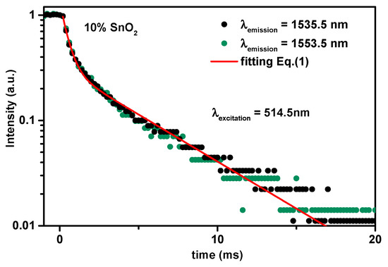 Decay curves of the luminescence from the 4I13/2 metastable state recorded at 1535.5 nm (black dots) and 1553.5 nm (green dots), acquired using the 514.5 nm Ar+ laser beam, of Er3+ in 90SiO2-10SnO2:0.5Er3+ monolith heat treated at 900 °C for 40 h. The fitting curve is acquired based on Equation (1).