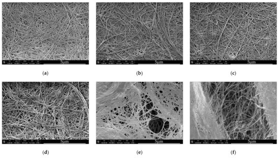 Scanning electron microscope (SEM) images of cellulose nanofibers in (a) BNC, (b) BNC/κ-Car0.2, (c) BNC/κ-Car0.5, (d) BNC/κ-Car0.8, (e) BNC/κ-Car2.0, and (f) BNC/κ-Car4.0. The images were recorded at the magnification of 40,000× (bar—5 µm).