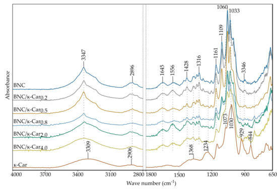The Fourier-transform infrared spectroscopy (FTIR) spectra of BNC, κ-Car and BNC/κ-Car composites at wave numbers ranging from 4000 to 650 cm−1.