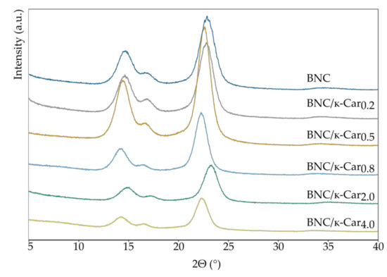 The XRD method was used to determine the crystallinity index (CI) of the BNC/κ-Car composites (Table 2). The diffraction patterns (Figure 4) contain three main peaks that are present at ~14.66°, ~17.26° and ~22.90° for the (101), (10–1) and (200) planes, respectively, and they may be identified as the reflection planes of cellulose I [30]. The peaks in the diffraction curve of all the samples were relatively broad, because BNC contains amorphous regions apart from the crystalline areas. With the increase of κ-Car concentration, the CI of BNC/κ-Car decreased, from 87.6% for pure BNC to 77.4% for BNC/κ-Car4.0. This may suggest the occurrence of interactions between cellulose ribbons and helices or coils of κ-Car during crystallization process. These results are consistent with the FTIR data.