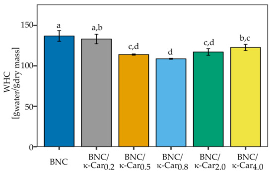 Water holding capacity of BNC and BNC/κ-Car composites (The data are presented as the means ± SD from at least three independent experiments; the means that are marked with different letters are significantly different).