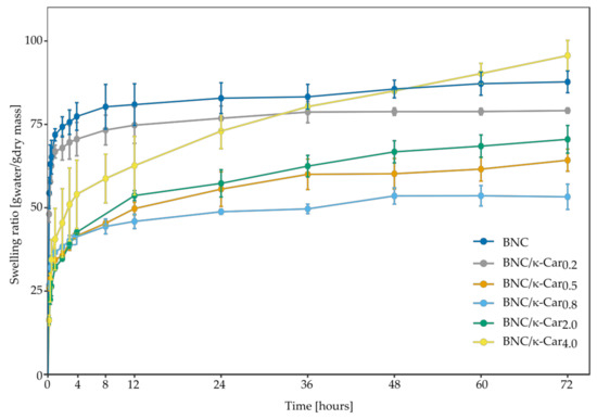 Swelling ratio of BNC and BNC/κ-Car composites. (The data are presented as the means ± SD from at least three independent experiments).