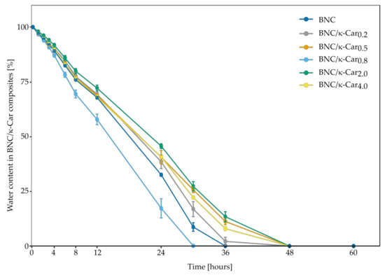 The water retention rate of BNC and its composites is a vital parameter in case of medical applications [50]. Like WHC, WRR is affected by the thickness and structure of fibers as well as the presence of additives inside the membrane [33]. Interestingly, the WRR profiles of the BNC/κ-Car composites obtained in this study were different from the WHC profiles. In case of BNC/κ-Car prepared by the first method, the rate of water evaporation decreased with the increase in κ-Car concentration, with an exception of BNC/κ-Car0.8 (Figure 7). The similar observations were reported by [51] who studied the effect of an increasing concentration of a single sugar on the α-linked glucuronic acid-based oligosaccharide. The positive impact of carrageenan on WRR of carrageenan/hydroxymethyl cellulose composites was also reported [52]. In this study, the differences between the composites were visible after 6 h of drying process. Presumably, the molecules of water, which were physically attached to the surface of membranes, were evaporated within this time. Noteworthy, these molecules accounted for less than 20% of bound water. The diffusion of the remaining water molecules, which were entrapped between the fibers, took either 36 h (BNC) or 48 h (BNC/κ-Car0.2 and BNC/κ-Car0.5). The composite BNC/κ-Car0.8 was characterized by the significantly lower value of WRR that may be ascribed to the high thickness of fibers and enhanced porosity, which were visible in the SEM images. Presumably, these parameters had the greater impact on WRR than the presence of κ-Car. Because of the lower surface area and expanded pores, water molecules that are bound either to the surface or inside the membrane may be removed much easier. WRR values of BNC/κ-Car2.0 and BNC/κ-Car4.0 were similar and water evaporation took up to 48 h. The effect of κ-Car incorporation into the surface layers of membranes was noticeable. The diffusion of water was hindered like in case of the swelling behavior of modified BNC and within 24 h, BNC/κ-Car2.0, BNC/κ-Car4.0 and BNC lost 55, 60 and 68% of bound water, respectively.