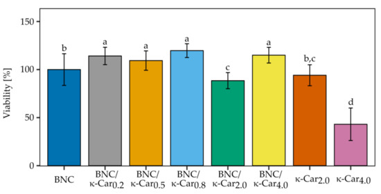 The viability of ATDC5 cells after 21 days of growing on the surface of BNC and BNC/κ-Car composites. (The data are presented as the means ± SD from at least three independent experiments; the means that are marked with different letters are significantly different).