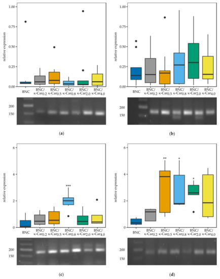 The Col1α1 expression was found to be nearly the same in case of all BNC/κ-Car composites as compared to the ATDC5 cells growing on either plastic surface (data not shown) or pure BNC. In case of the majority of BNC/κ-Car composites the expression level of Col2α1 was slightly higher than in the control sample. The only exception, for which the level of expressed Col2α1 was statistically increased was the BNC/κ-Car0.8 composite. Sox9 expression was significantly enhanced in case of all the composites with higher κ-Car concentration, namely BNC/κ-Car0.5, BNC/κ-Car0.8, and BNC/κ-Car2.0. Finally, low expression level of Runx2 shows that none of the composites tested induced the chondrocyte hypertrophy. Thus, the results of this study showed that BNC/κ-Car composites supported the dedifferentiation of ATDC5 cells to more chondrogenic phenotype, as demonstrated by the increase in the expression of chondrogenic marker genes Col2α1, Sox9 and the decrease of Col1α1 and Runx2 expression.