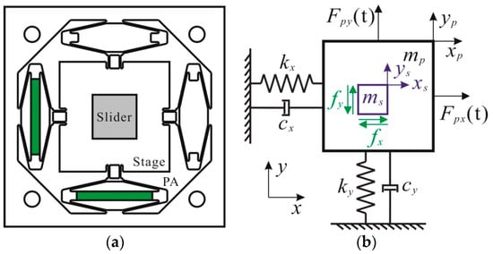 The proposed 2-DOF linear PIDM is shown in Figure 1a and is made up of two orthogonal PAs, a stage, and a slider. According to present studies, the 2-DOF linear PIDM can be regarded as two spring–mass–damper systems. The simplified system of the PIDM is shown in Figure 1b, where mpx is the equivalent mass of the PA and stage in the x-axis, xp is the distance of the PA in the x-axis, xs is the distance of the slider in the x-axis, kx is the stiffness of the PA and stage in the x-axis, cx is the damper of the PA and stage in the x-axis, Fpx(t) is the equivalent driving force of the PA in the x-axis, fx is the friction force in the x-axis, msx is the mass of the slider in the x-axis, mpy is the equivalent mass of the PA and stage in the y-axis, yp is the distance of the PA in the y-axis, ys is the distance of the slider in the y-axis ky is the stiffness of the PA and stage in the y-axis, cy is the damper of the PA and stage in the y-axis, Fpy(t) is the equivalent driving force of the PA in the y-axis, fy is the friction force in the y-axis, and msy is the mass of the slider in the y-axis [,].