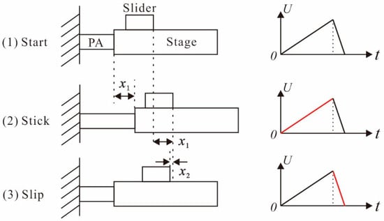 When the x-axis and y-axis motions of the 2-DOF PIDM are driven independently, there is no coupled motion and the control is very simple. Taking the x-axis motion of 2-DOF PIDM as an example, the working principle is shown in Figure 2. One working cycle can be divided into three parts: (1) initial state: all components of the structure are still and they stay in their initial positions; (2) stick state: with the slow rise of the driving voltage, the PA extends to a length of x1 and the stage moves along the PA with the distance of x1 in a low speed as a result of the static friction force; (3) slip state: with the sudden decrease of the driving voltage, the PA contracts back to its original position quickly. The stage is adhered to the PA, so the stage moves back to its original position with a high speed. Because the slider moves by the friction force between the contact surface of the stage and slider, the speed of slider is less than the speed of the stage. Thus, the slider cannot catch the stage and it moves back with a small displacement of x2. After the working cycle, the slider moves forward with a stepping displacement of x1–x2. With repeated working cycles, the slider will move forward continuously. When the driving voltage rises rapidly and falls down slowly, the slider will move backward [].