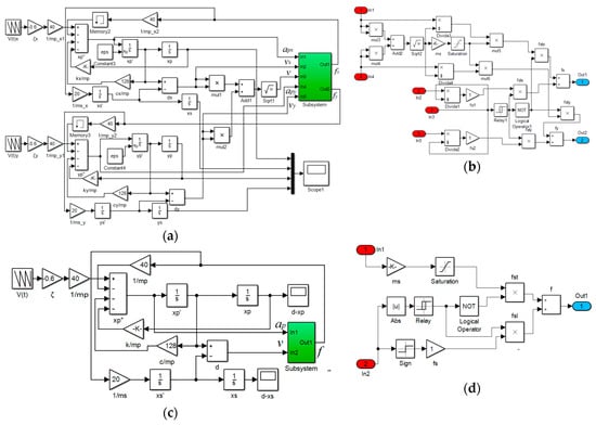 Simulation block: (a) 2-DOF whole block diagram; (b) 2-DOF subsystem block diagram; (c) 1-DOF whole block diagram; (d) 1-DOF subsystem block diagram.