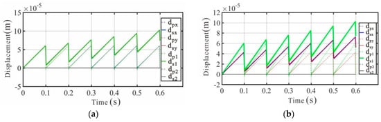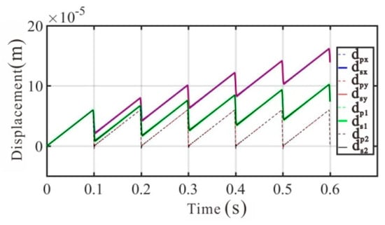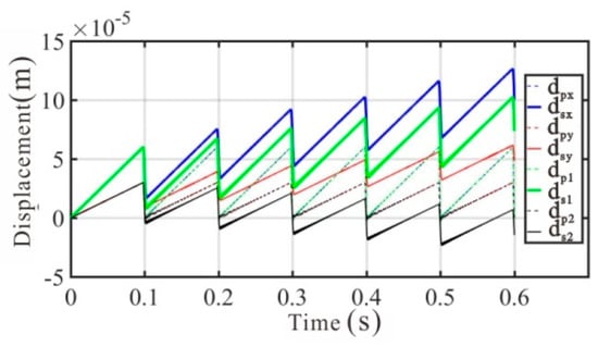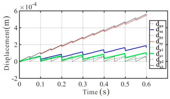 The results in Figure 5a show that curve-dpx and curve-dp1 are the same sawtooth curves, and the results of curve-dsx and curve-ds1 are the same output stepping displacement curves. All curves in the y direction and the corresponding 1-DOF PIDM are horizontal lines with a magnitude of 0. The results in Figure 5b show that curve-dpx and curve-dpy are the same sawtooth curves (dotted curves), and curve-dsx and curve-dsy are also the same sawtooth curves (solid curves). Figure 5b shows that the maximum value of curve-dp1 is about √2 times than that of curve-dpx (in one cycle), and the maximum value of curve-ds1 is about √2 times than that of curve-dsx (in one cycle). The results indicate that the two-dimensional extended Karnopp friction model in the 2-DOF parallel linear PIDM is correct.