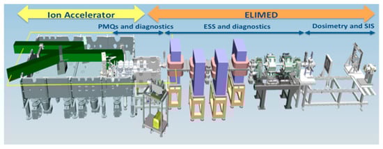 The main sections of the ELI multidisciplinary applications of laser-ion acceleration (ELIMAIA) beamline (ion accelerator and ELI medical and multidisciplinary applications (ELIMED)) consist of different subsystems: acceleration, collection, and diagnostics; selection, transport, and diagnostics; and dosimetry and sample irradiation [].