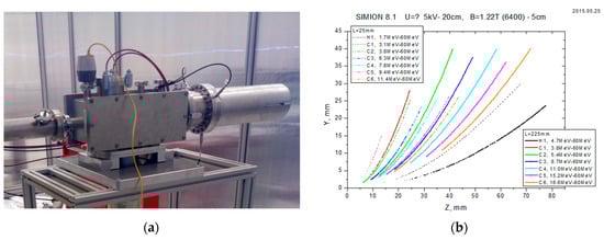 The ELIMAIA TPS was designed, realized, and calibrated at ELI-Beamlines. Figure 2 shows a picture of the ELIMAIA TPS (Figure 2a). Ion trajectory simulations, using the particle accelerator tracking code SIMION [], were perfomed to optimize TPS geometry and parameters and to investigate the energy resolution achievable.