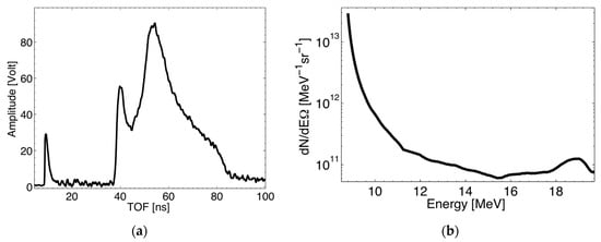A TOF signal structure consisiting of a peak arising from UV, X-rays, and fast electrons emitted from the target and a peak generated by the fast proton group can be observed in Figure 5a. Ions other than protons are stopped in the thick Al absorber placed in front of the detector. The short peak appearing at the beginning of time axis (7–12 ns) corresponds to the so-called photo-peak and fixes the starting point for the acquisition, that is, the trigger signal. As one can see in Figure 5a, the low sensitivity of the diamond detector to the plasma visible and soft-UV radiation reflects in a narrow photo-peak compared with other detectors such as Faraday cups and ion collectors, allowing to disentangle the high-energy proton component, characterized by short TOF, also at short flight path as in this case [,]. The Al filter allows selecting a TOF interval in which the signal, being uniquely generated from protons, can be directly converted in energy distribution using the analysis procedure developed for high-energy (up to 100 MeV level) proton spectrum reconstruction, which takes into account the detector response and the proton energy loss inside the detector thickness using a Monte Carlo approach. Figure 5b shows the proton energy distribution extract related to the TOF signal of Figure 5a. Proton energy cut-offs, distribution, and flux were compared with the ones obtained with the RCF stacks and the TPS placed at the same distance and similar angle with respect to the diamond detector. The comparisons, discussed elsewhere, show a rather good agreement confirming the reliability of TOF technique coupled with the use of diamond detectors and the developed analysis method for high-energy laser-accelerated proton diagnosis. These results also demonstrate that the resolution achievable in high-energy proton TOF measurements with such thin diamond detectors allows monitoring online key features of high energy protons accelerated from high-repetition rate laser systems, such as maximum ion energy and flux, up to 100 MeV level even at about 2 m from the source. Thanks to diamond`s time resolution, it will be also possible to measure the energy bandwidth of the proton beam selected downstream at a user beamline such as ELIMAIA []. Moreover, in order to provide measurement of the beam energy spectrum and cut-offs as a function of the emission angle from the source, which is extremely important to characterize the whole beam profile and angular distribution of ion beams with a broad angular aperture (typical divergence >30°), such as the ones accelerated by lasers, an array of diamond detectors, placed at different angles with respect to target normal direction, will to be assembled and tested.