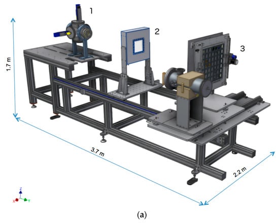 ELIMAIA consists of two main subsystems: the ion acceleration platform and the ELIMED (ELI medical and multidisciplinary applications) user application line (ion beam transport and dosimetry). A 3D rendering of the ELIMAIA beamline (Ion Accelerator + ELIMED) is shown in Figure 1. A complete description of ELIMAIA, including ELIMED, is reported in the literature []. The ion acceleration platform consists of a double plasma mirror chamber; a local laser diagnostics station; and an interaction chamber providing laser beam transport, pulse treatment, ion source generation, and in-situ ion and plasma characterization. The ELIMED user application line will provide ion beam transport (permanent magnet quadrupoles, PMQs), energy selection (resistive dipole chicane system, ESS), ion diagnostics and shaping, online dosimetry, and in-air sample irradiation end-station for users to enable them to apply laser-driven ion beams in multidisciplinary fields [,].