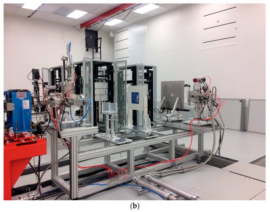 The first detector, which is traversed by the transported beam in air, is an in-transmission multi-gap ionization chamber (MGIC), aiming to on-line monitor the dose shot-by-shot (Figure 6). The MGIC is composed by two independent gaps, operated at different voltages, and it is a monitor that, once calibrated with an absolute detector for dosimetry, measures the dose delivered at the irradiation point. Specifically, the detector for measuring the absolute dose at the ELIMAIA beam line is a Faraday cup, which is able to measure the collected charge once coupled to an electrometer []. The information on the transported charge by the primary particles, coupled by a measurement of the beam area and the energy spectrum, provides the dose at the irradiation point. A sample irradiation system (SIS) can be easily placed at the same position where the beam has been previously calibrated, in order to deliver specific amounts of dose per sample, remotely controlling the sample positions (Figure 6). Further details for all the mentioned elements will be given in the next section. The output from the detectors is processed by a dedicated software, which collects the acquired signals and provides a feedback for the laser system, once the required dose at the irradiation point is achieved. Figure 6b shows a picture of the in-air final section for dosimetry and sample irradiation installed along the ELIMAIA beamline. All the elements are placed in translating stages assembled in linear rails, in order to easily change their relative positions (Figure 7).