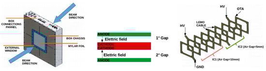 The two gaps are placed in the center of an aluminum box of 420 × 420 × 100 mm3 of size (Figure 9), and an external window of aluminized mylar is present in front. The modularity of the device will give the possibility to eventually add, in future, additional gaps for redundancy.