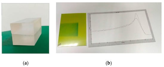 (a) PMMA phantom used to fix the radiochromic film (RCF) for longitudinal dose distributions; (b) An example of RFC irradiated with conventionally accelerated 62 MeV proton beams using the mentioned phantom, where it is clearly visible the increasing of darkness (and consequently, of dose) in proximity of the beam range.