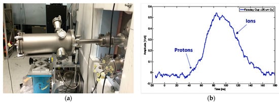 (a) Picture of the ELIMAIA FC installed in target chamber; (b) Ion signal acquired by the FC at about 3 m from the target.