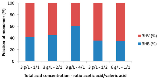 3.2. Copolymer PHBV Production from Acetic Acid and Valeric Acid