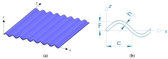 The analysis considers a corrugated plate with length , width and thickness , as shown in Figure 1a. More details about the corrugations are shown in Figure 1b, where the parameter defines the length of half wave of a sinusoidal wave, and refers to the height of the sinusoidal wave. To derive the constitutive equations, we adopt a new One-Variable First-order Shear Deformation Theory (OVFSDT) which is compared to some further plate theories from literature. According to the proposed theory, the displacement field is defined as