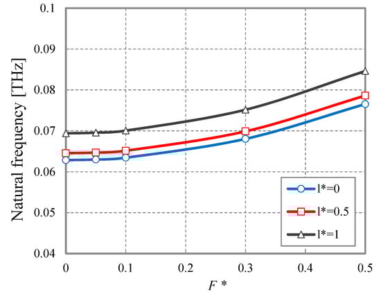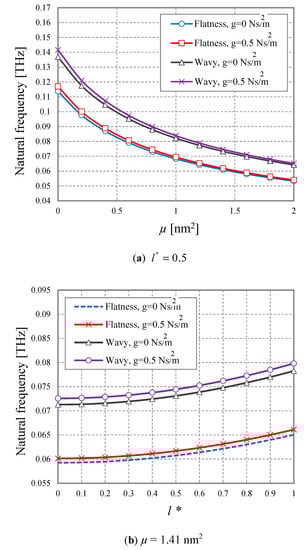 Figure 2 shows the variation of the natural frequency with the non-local parameter (Figure 2a) and dimensionless length scale (Figure 2b) within the proposed formulation, where both flat and curved geometries are compared in the presence or not of the viscoelastic damping parameter, namely Ns/m2 or Ns/m2. The nanoplate features two sinusoidal corrugations with amplitude (i.e., dimensionless amplitude ) and semi-length . Based on Figure 2, an increased non-local coefficient yields to a reduced natural frequency, whereas an increasing length scale parameter gets to an increased natural frequency of the nanostructure because of its increased stiffness, under the non-local strain gradient theory. This agrees with findings by Malikan and Nguyen []. Moreover, the natural frequency of the flat nanostructure is lower than the corrugated one, for the same fixed non-local coefficient (Figure 2a) and dimensionless length scale (Figure 2b). Remarkably, all the curves in Figure 2 are almost scalable with the varying geometry and damping parameter. A negligible increase in the natural frequency is also observed for an increasing viscoelastic damping parameter . Note that the equations based on the nonlocal strain gradient theory revert to the classical mechanics ones, when the length scale and nonlocal parameter are exactly the same (i.e., when is equal to ). Based on a comparative evaluation of Figure 2a,b, it is worth noting that the response of the nonlocal parameter compared to the length scale , is more sensitive for each fixed geometry and damping parameters of the nanostructure.